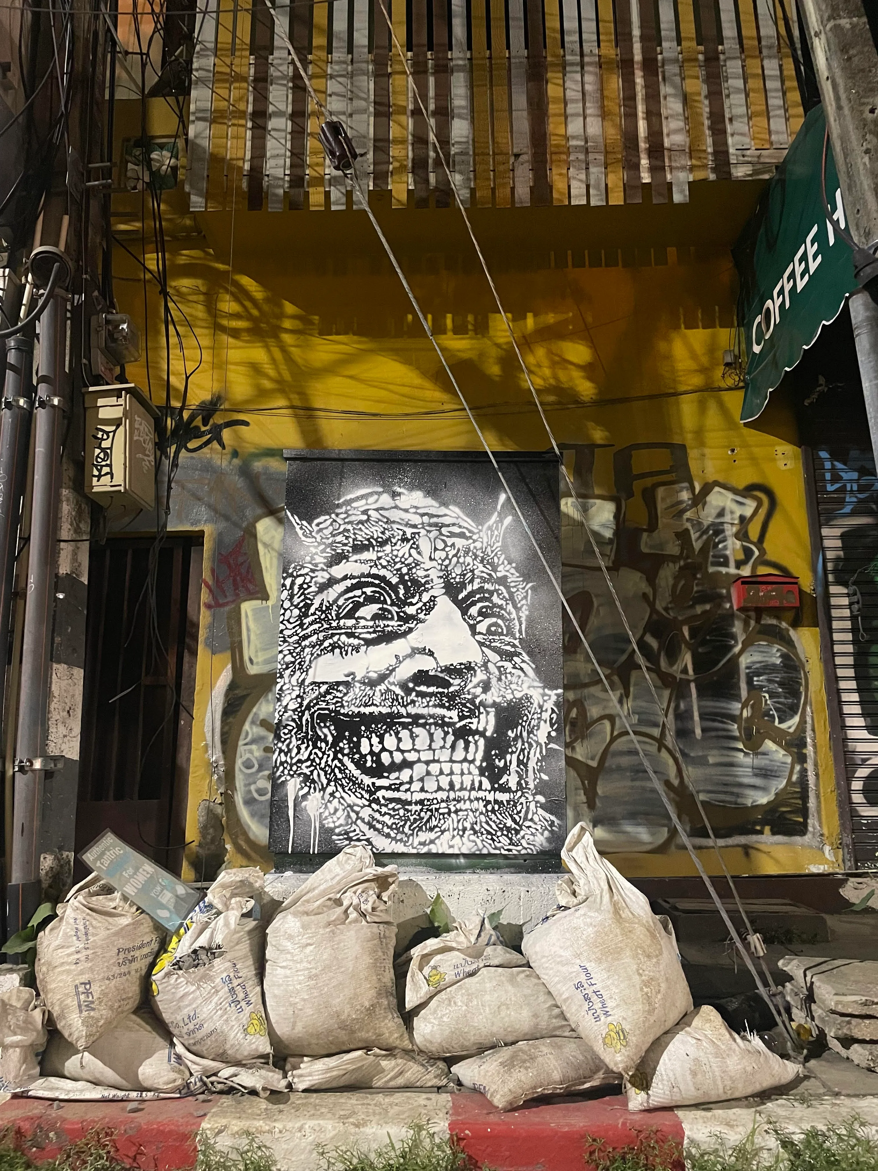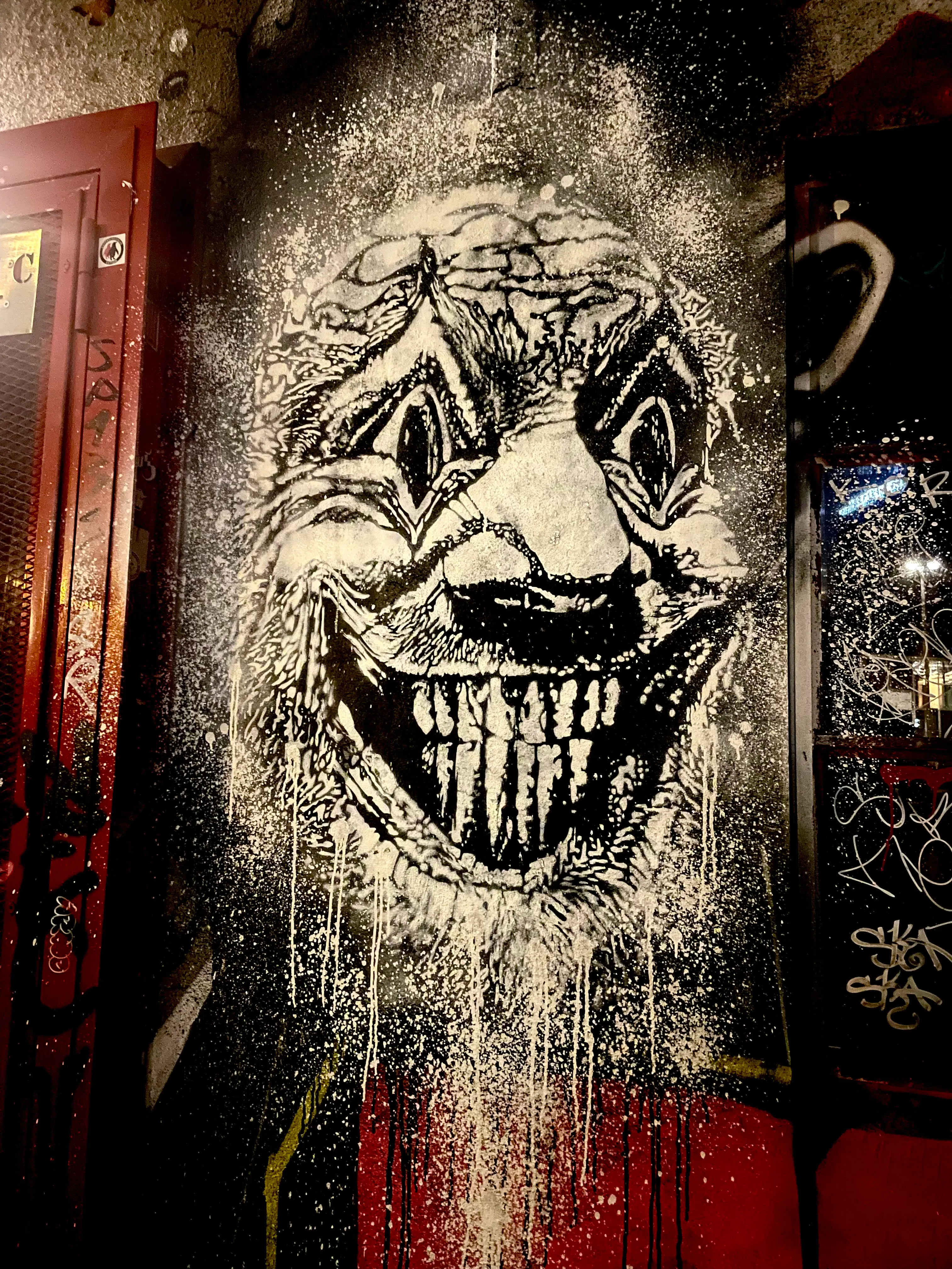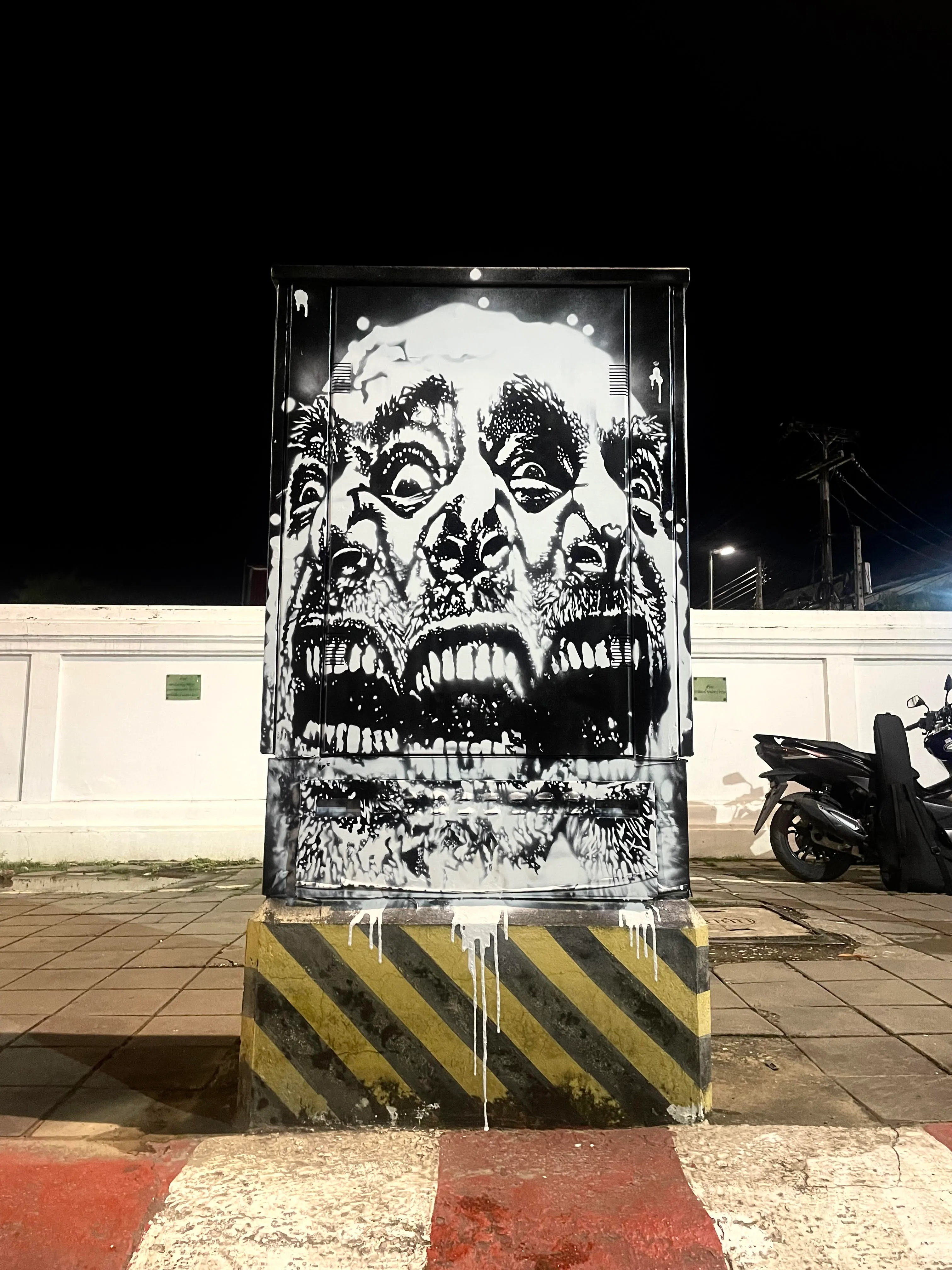 The artworks are in constant dialogue with its surroundings and passers-by, thanks to its public location. The monotone urban landscape is contrasted with the horrified emotions in the artist’s work. The face remains a silent witness whose screams are drowned out by the business-as-usual atmosphere of the city it finds itself in. The expressive face which marks the pieces therefore creates a space of shared emotions between the artist and the viewer. In doing so, it creates a bridge between two strangers through the power of raw emotions. Using monochromatic lines and sharp contrasts to emphasise the underlying tension of the face, Sicksociety achieves a careful balance of disturbing imagery with a sense of vulnerability.