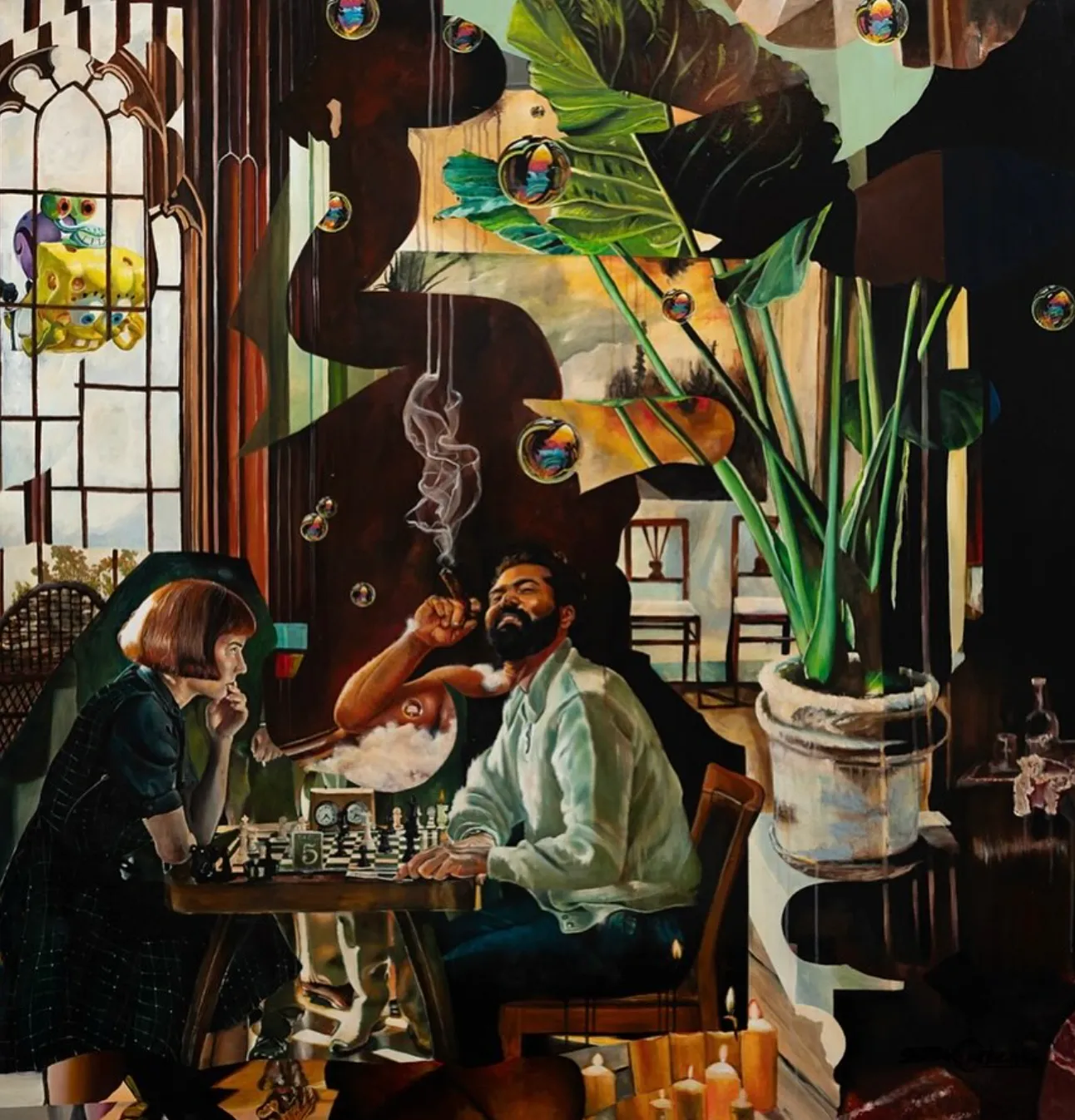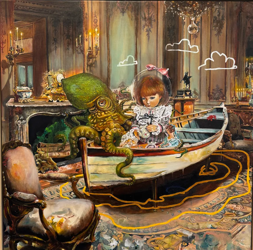 Multiple narratives weave themselves into each other throughout the paintings, giving them their surrealistic feel. The wide array of different elements overlapping each other in these paintings will give the viewers an opportunity to examine them for hours, allowing them to make their own connections and thus inspiring a surrealistic collage of their own.