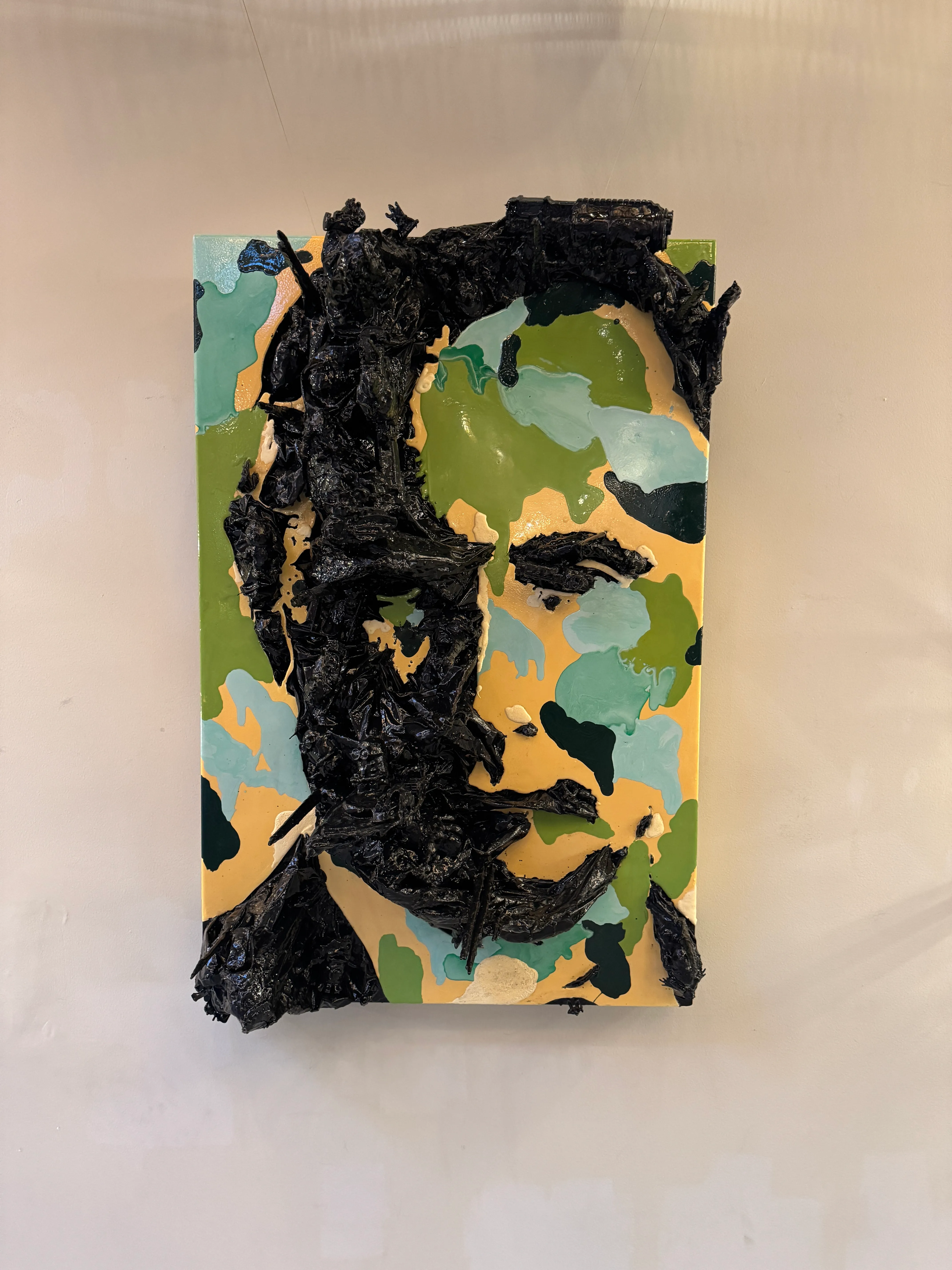 Marcelo Segall’s latest installation at Unknown Amsterdam is a powerful reflection on the intersection of power, violence, and economic systems. At its center, the face of a ruler emerges in camouflage tones, layered with scorched textures. It is a portrait that is both revered and corroded.